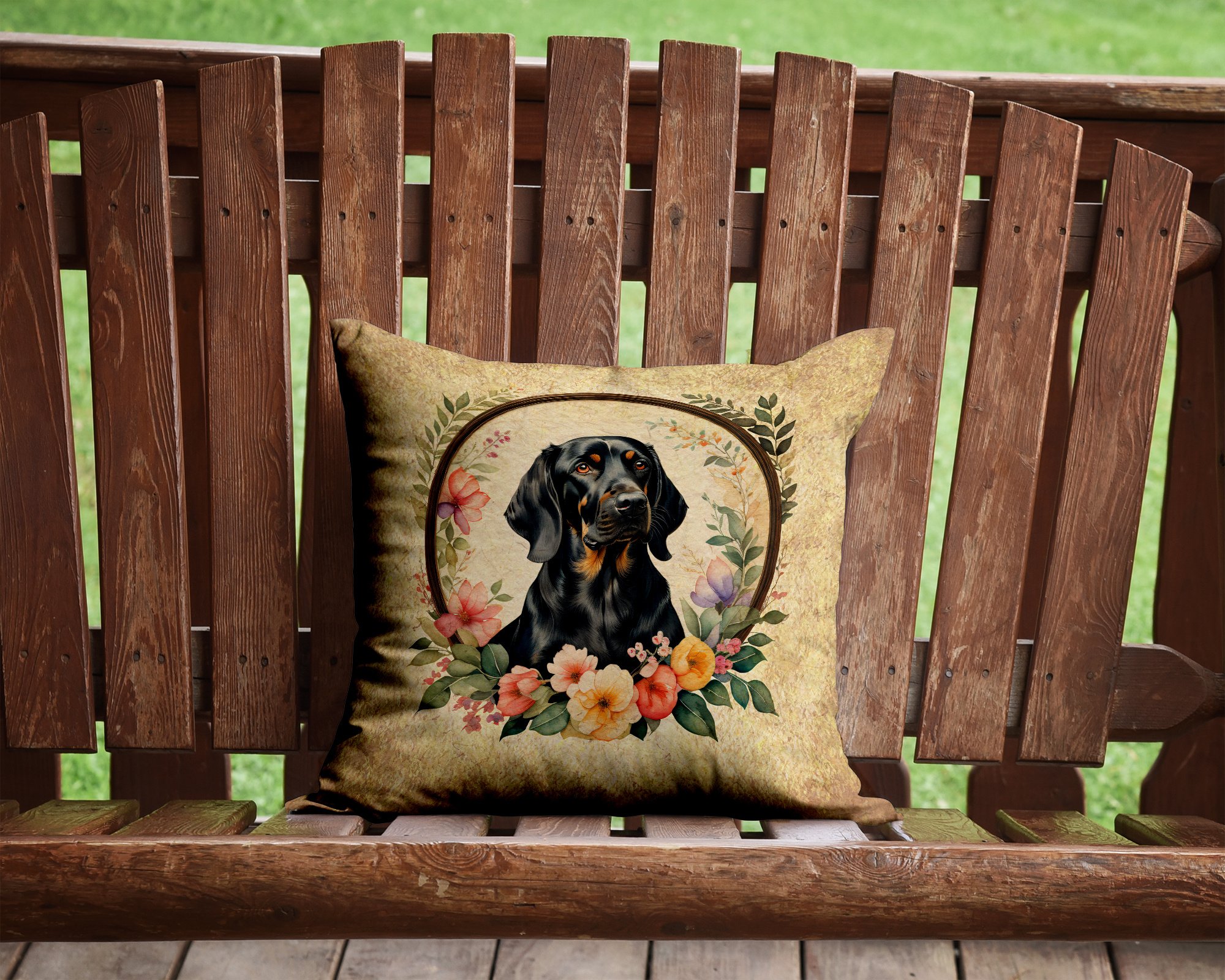 Home > Black and Tan Coonhound and Flowers Throw Pillow Machine Washable, Indoor Outdoor Decorative Pillow for Couch, Bed or Patio, 14Hx14W