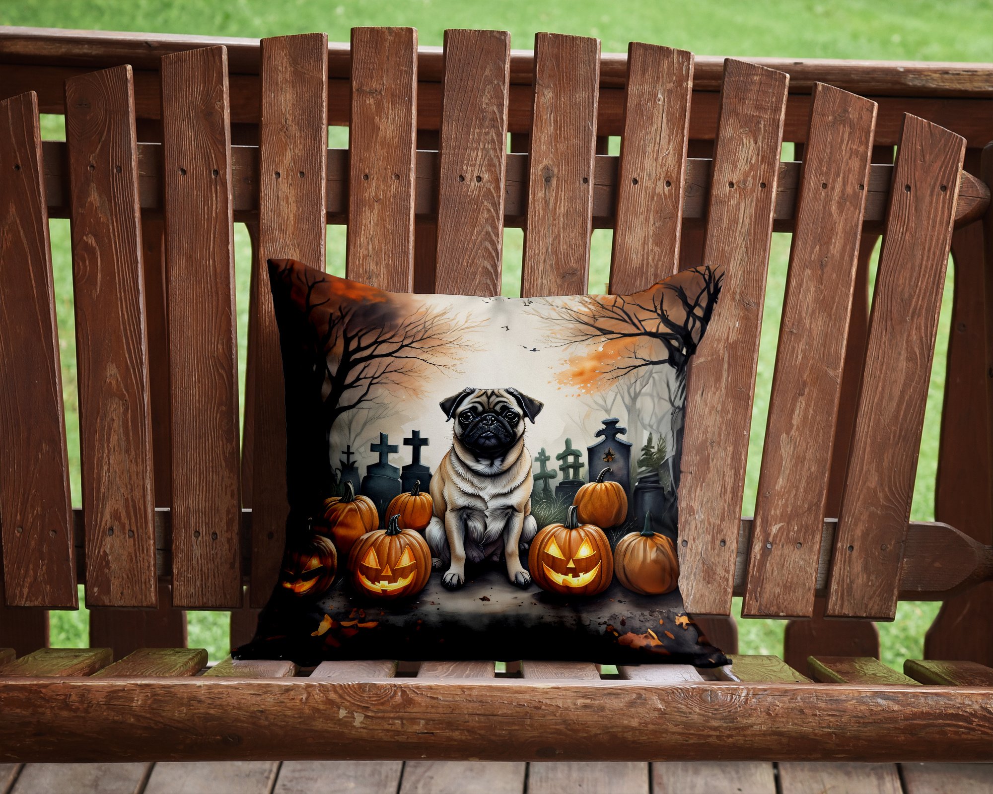 Throw Pillow featuring breed specific Pug artwork. Celebrate Halloween with this Halloween Pillow. Add a touch of vibrancy and comfort to your outdoor seating with Caroline's Treasures Fabric Decorative Pillow. Measuring approximately 14 inches by 14 inches, this outdoor pillow is crafted to elevate the appeal of your patio furniture, infusing it with vivid color and artistic flair. The pillow includes a 100% Polyester Fabric sham filled with a quality pillow form to provide superior comfort. Innovatively made from our brand new material, specifically woven for its water resistance, this pillow is designed for durability. The soft canvas fabric offers versatility in use, fit for your indoor couch or your outdoor patio, porch, or veranda. The fabric is dyed with colorfast dyes built for resilience against weather conditions, ensuring the pillow retains its beauty over time. Constructed by sewing three fabric pieces to create a sham, the polyester insert is then nestled inside to form the pillow, resulting in an overstuffed pillow that maintains its shape. Both the sham and the pillow insert are proudly made in the United States. As the pillows are handcrafted, there may be minor variations in size, further enhancing their unique charm. Experience comfort in style with Caroline's Treasures Fabric Decorative Pillow.