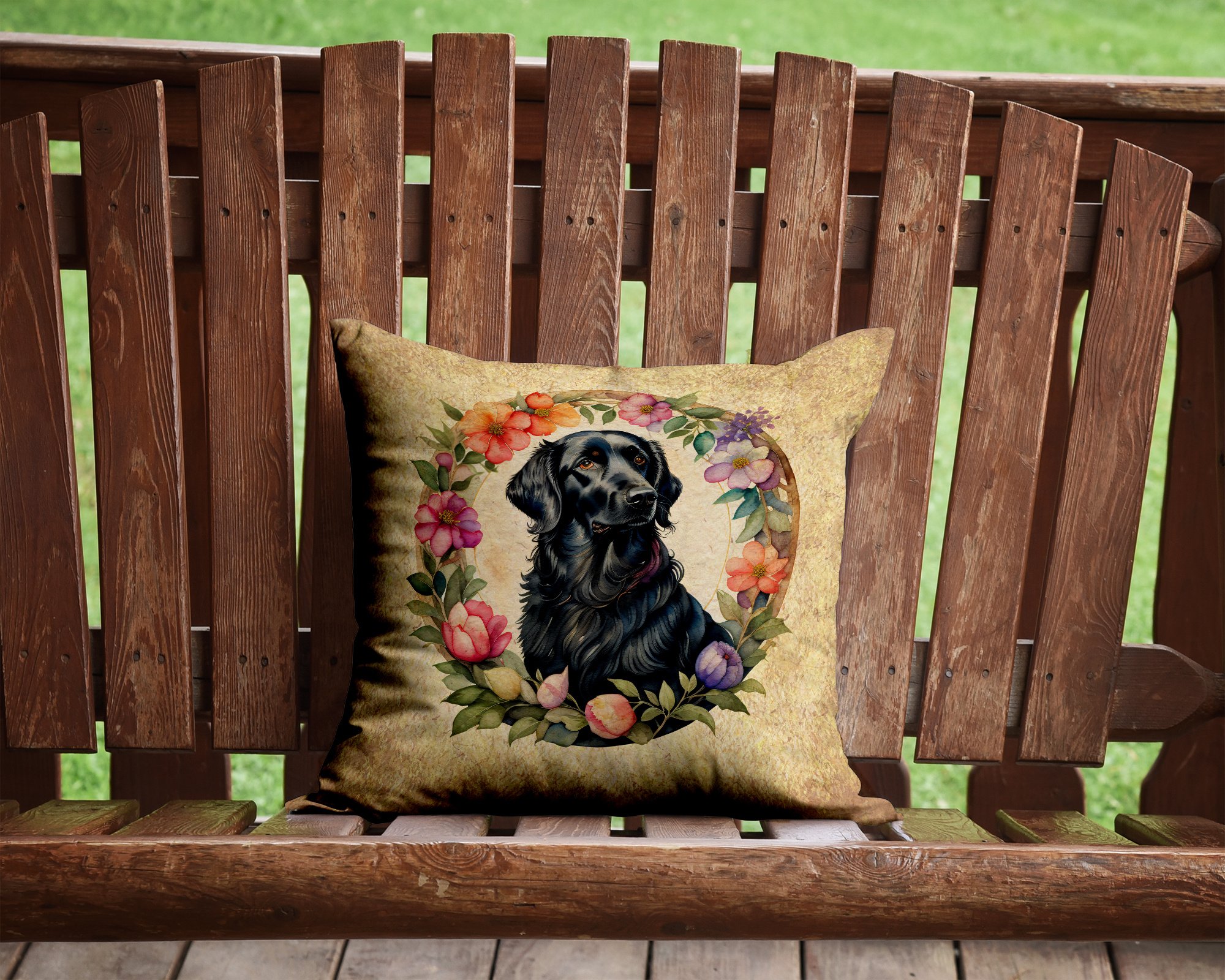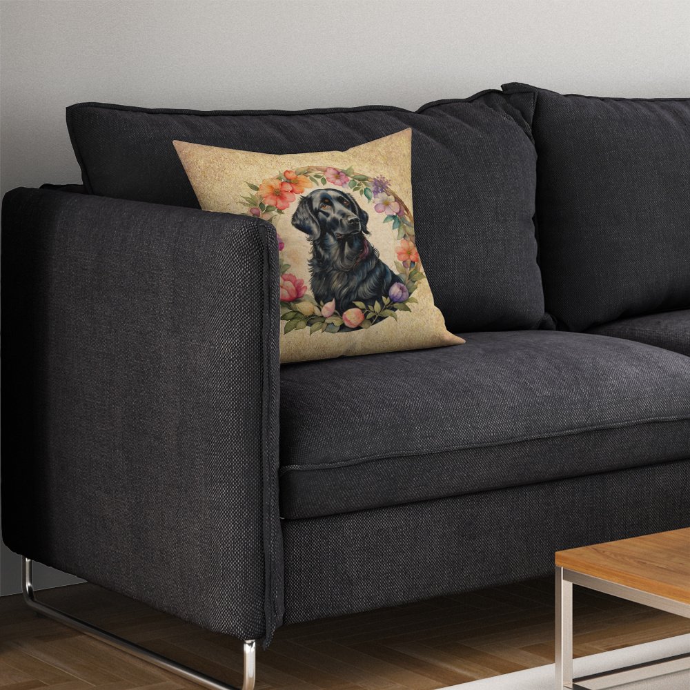 Flat-Coated Retriever and Flowers Throw Pillow Machine Washable, Indoor Outdoor Decorative Pillow for Couch, Bed or Patio, 14Hx14W