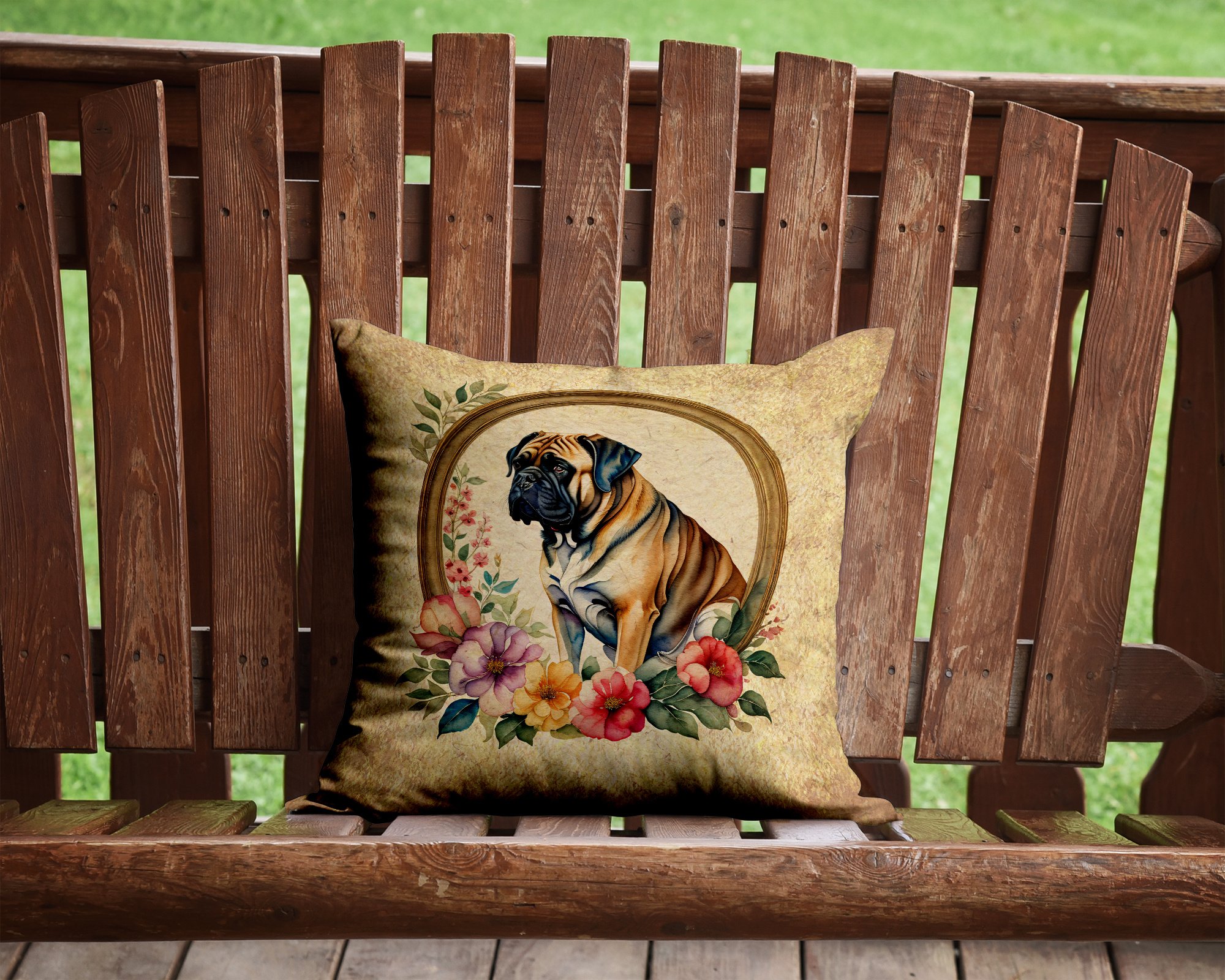 Mastiff and Flowers Throw Pillow Machine Washable, Indoor Outdoor Decorative Pillow for Couch, Bed or Patio, 14Hx14W