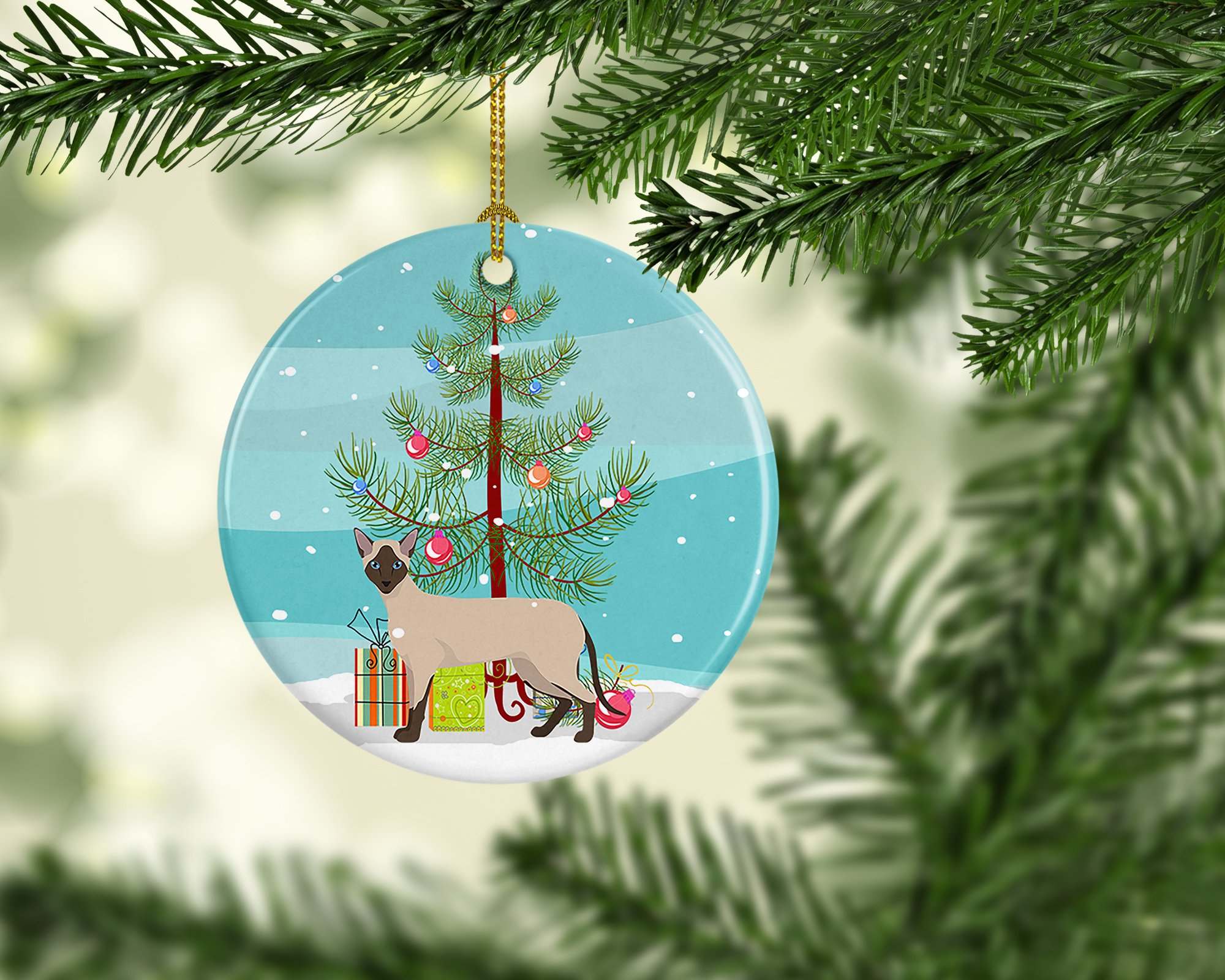 Ceramic Ornament featuring breed specific Siamese artwork. Celebrate Christmas with this Christmas Ornament. This Ceramic Ornament is from Caroline's Treasures collection Merry Christmas Tree. Add a touch of personalized charm to your Christmas tree this holiday season with our Ceramic Ornament. Measuring 2.8125 inches in diameter, this round porcelain ornament beautifully reflects your festive lights, enhancing your holiday decor. The gloss surface sets off the vibrant, full-color artwork contributed by one of our talented artists, bringing a pop of color and joy to your tree. This Ceramic Ornament doesn't stop at being merely decorative. The white back is designed for personalization. Write a heartfelt message, mark a special year, or inscribe a date with a paint pen or a permanent marker to create a treasured memento. Please ensure you allow any personalization to dry thoroughly before handling to maintain the pristine finish. Included with the ornament is a delicate gold cord for easy hanging. Made in the USA, this Ceramic Ornament makes an exceptional gift for a pet sitter, teacher, family member, or anyone you wish to share a little Christmas magic with. With its blend of style, charm, and personal touch, it's a meaningful addition to any Christmas tree. This Ornament is from Caroline's Treasures Cats category of products.