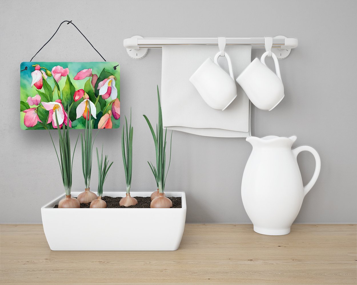 Wall or Door Hanging Prints featuring breed specific Minnesota Pink and White Lady s Slippers artwork. Add a splash of color and artistic flair to any indoor or outdoor space with our Aluminum Artwork Prints. These unique prints, featuring full-color, multicolor designs, provide a versatile decorative touch that can enhance a kitchen, bathroom, office, outdoor patio, or even the front door area. Each print measures 8 inches by 12 inches, making it the perfect size to catch the eye without overwhelming your space. Constructed with durability in mind, these prints can be placed outdoors and withstand direct sunlight for a significant amount of time before any fading begins. Designed for easy installation, each print features a black hanging rope and has a lightweight profile. This allows for quick hanging with just about any nail or screw. For safety and aesthetic appeal, the print's corners are gently rounded. The back of the print showcases a brushed silver color for an added touch of elegance. Rust and fade-resistant, these Aluminum Artwork Prints are not only beautiful but are also built to last. Elevate your space with these stunning prints, crafted with care and artistic passion.