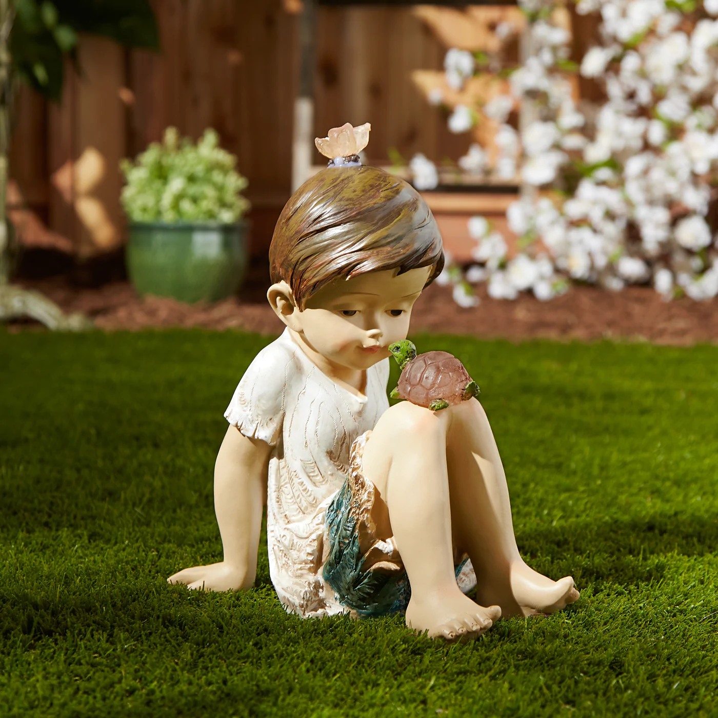 • A bright-eyed boy shares a playful moment with his beloved pet turtle and a visiting butterfly joins in the fun. Makes a playful lighting and décor addition to either your indoor or outdoor space!