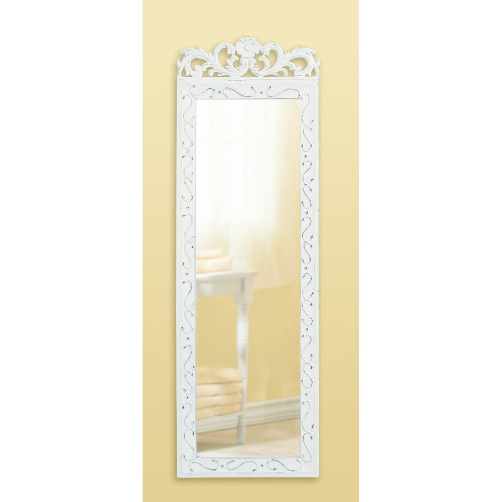 • A floral crown and embossed flourishes grace a weathered white wood frame mirror that reflects life's romantic moments.