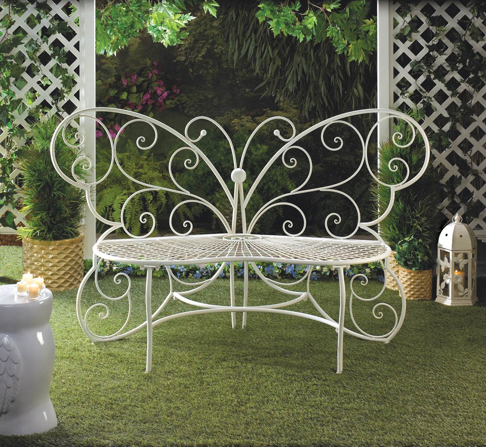 • Your garden can become a relaxing oasis with help from this beautiful butterfly bench. Featuring white painted iron shaped into a delicate butterfly, this bench is in shady spot under a tree or along a garden path for a place to relax and enjoy nature. Or sit side by side with a friend, sipping tea on a beautiful summer day. Max. weight limit: 440 lbs.