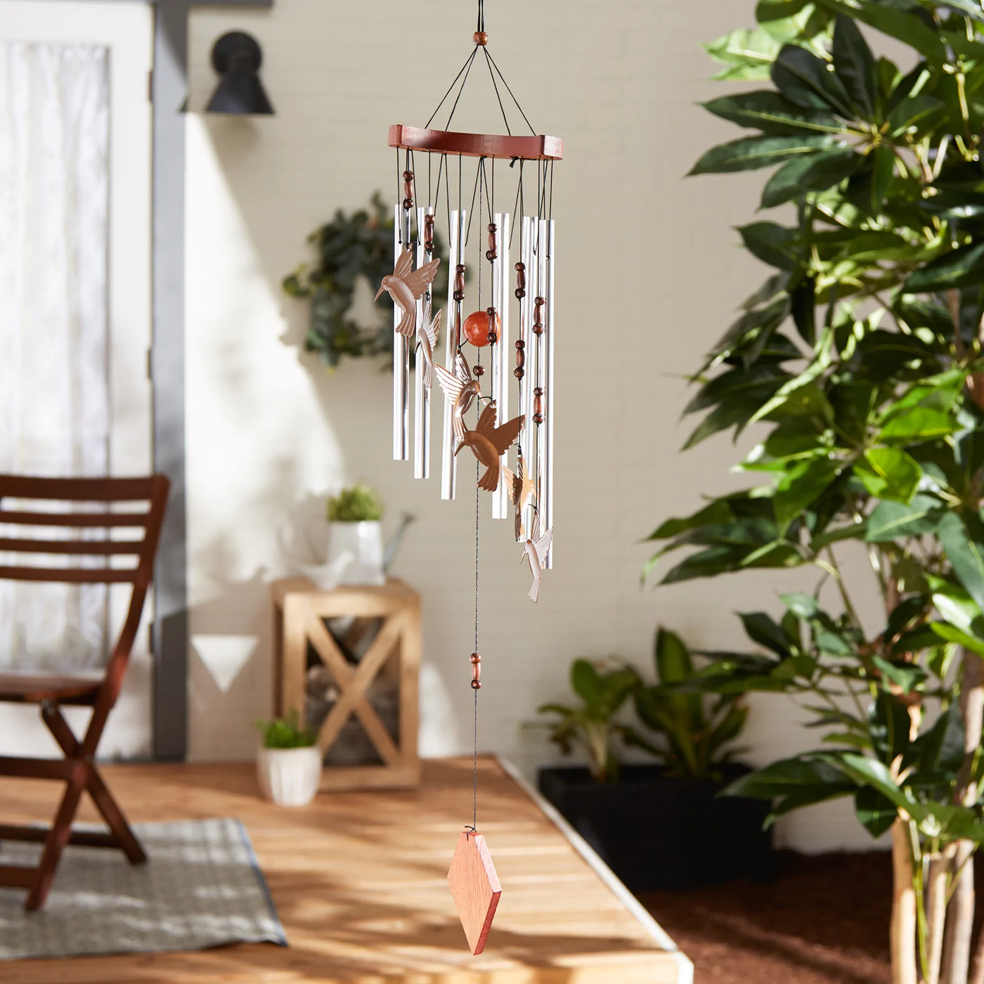 • Let the summer breeze sing you a magical song! This charming windchime features pretty hummingbird cutouts, gorgeous beads, metal chimes, and wooden accents at top and bottom.