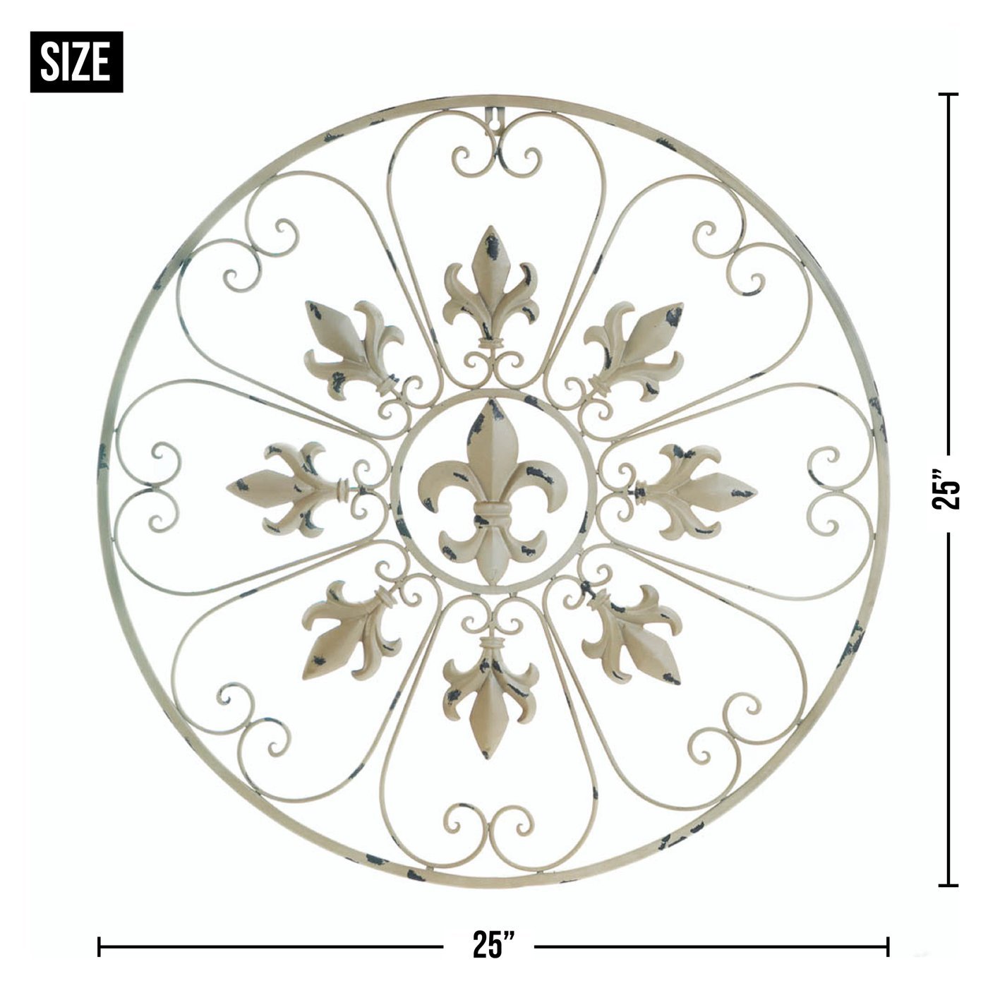 • This cool wall accent measures more than two feet in circumference, and will have a big impact on the style of your room. It features French inspired fleur- de-lis symbols and heart-shaped scrolls that will bring an abundance of style to your bare wall.