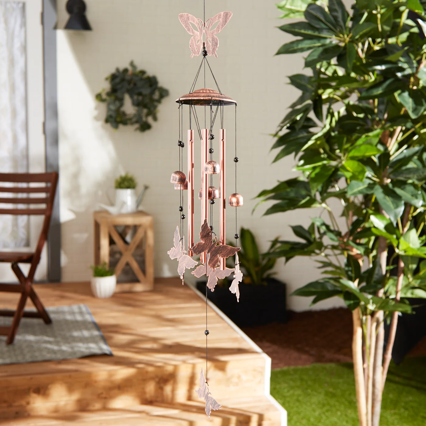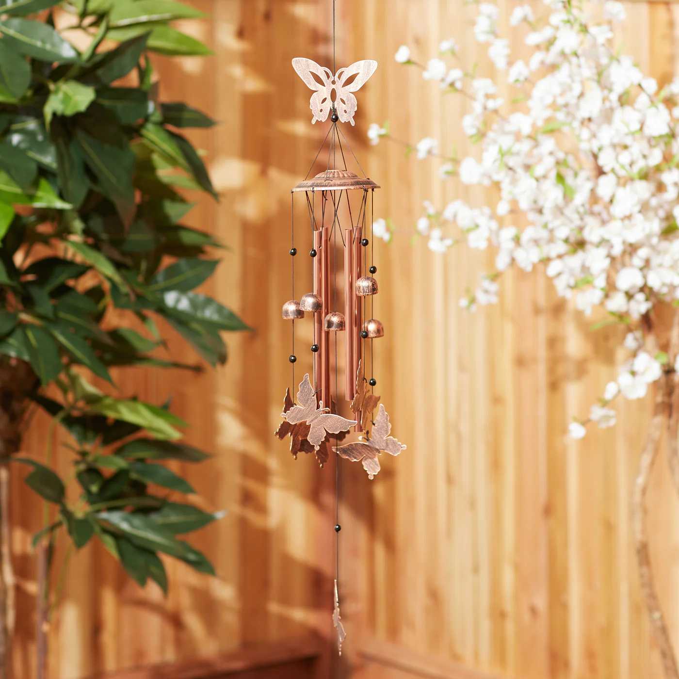 • A flock of butterflies to fill your days and evenings with sweet sound! This beautiful metal wind chime features a singular butterfly cutout on top, long chimes below along with small bells, and a group of butterflies that will twirl in the breeze.