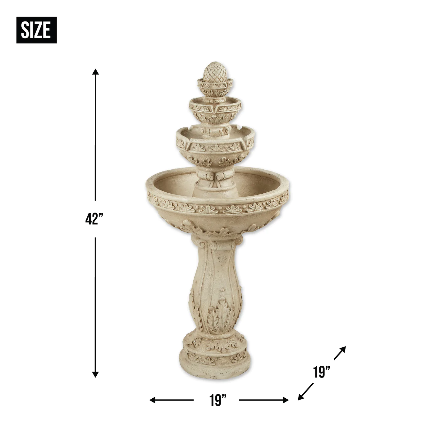 • Ivory color fountain weighs 24.0 lbs and measures 19.00" x 19.00" x 42.00".