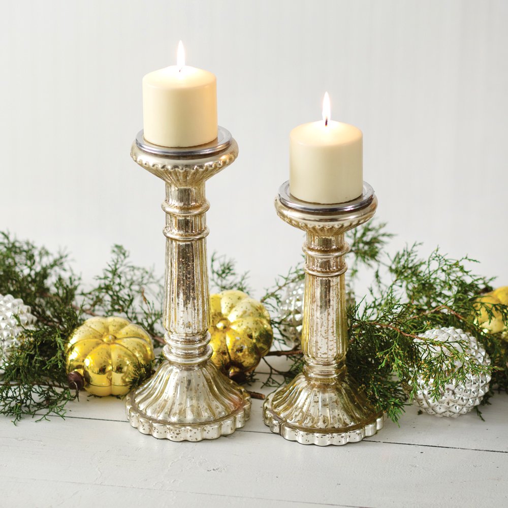 Home > Set of Two Mercury Glass Pillar Candle Holders
