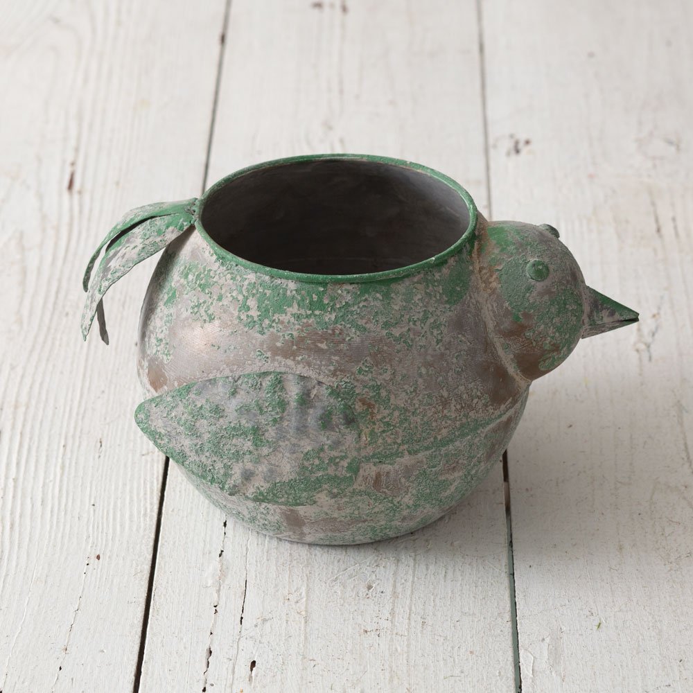 Use this rustic garden bird container as a planter, storage container, or tabletop decor. It is made of metal and has a rustic, green finish.