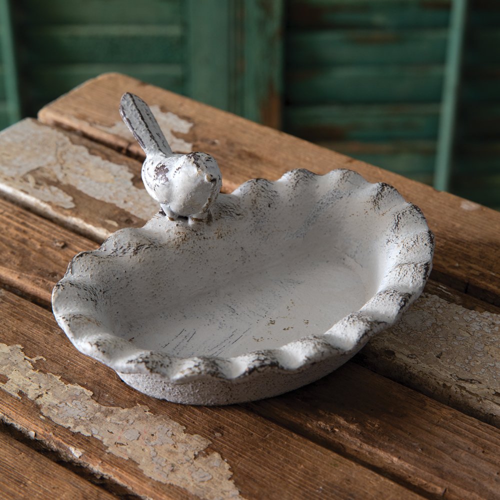 This dish is made of cast iron. Can be used outside as a tabletop birdfeeder or used inside as a votive candle holder or wrapped candy dish.